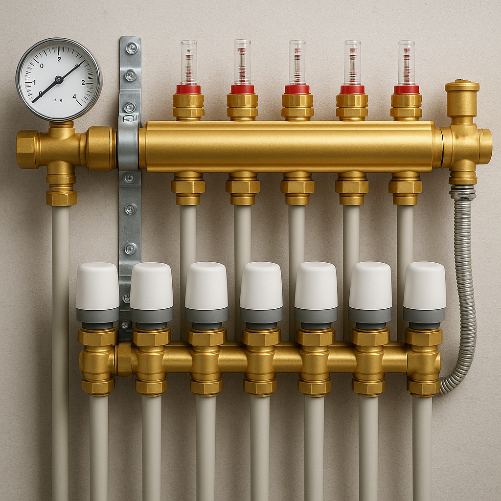 Podstawowy element instalacji podłogówki stanowi rozdzielacz. Jego rola polega na rozdzieleniu zasilania grzewczego do poszczególnych obiegów rur umieszczonych pod powierzchnią podłogi. W praktyce każdy obieg odpowiada za ogrzewanie określonej strefy w budynku. Rozdzielacz powinien być wyposażony w zawory regulacyjne oraz zawory odcinające, co umożliwia precyzyjne sterowanie parametrami przepływu w poszczególnych pętlach.