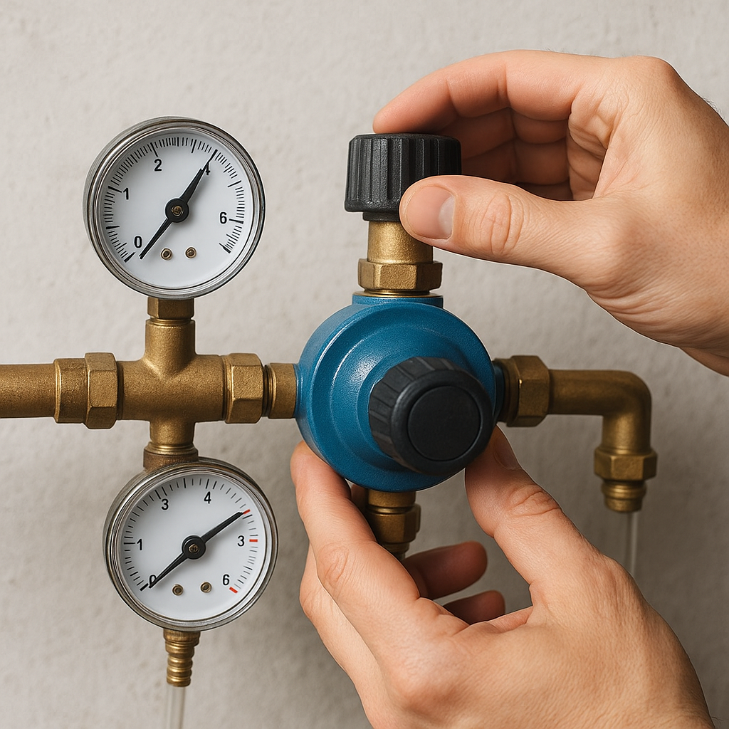 - Podłączyć manometr przed i za reduktorem, aby na bieżąco kontrolować ciśnienie wejściowe i wyjściowe.